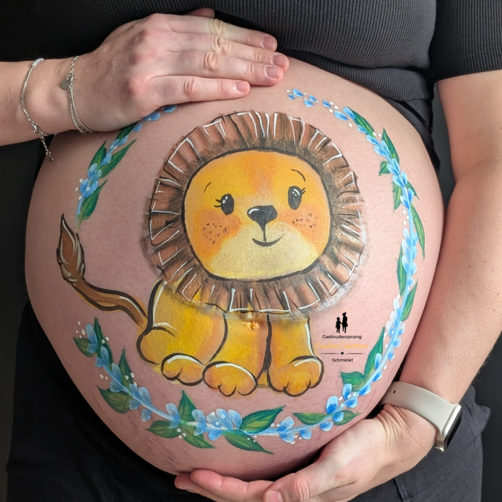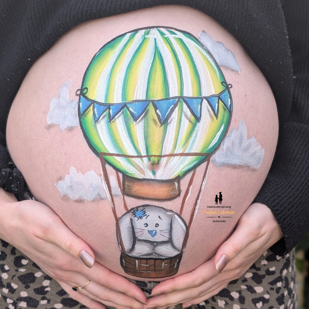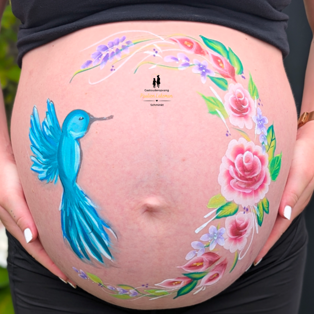 Het beschilderen van de buik gebeurt met schmink. Deze is op waterbasis en daardoor geheel veilig voor moeder en baby.
