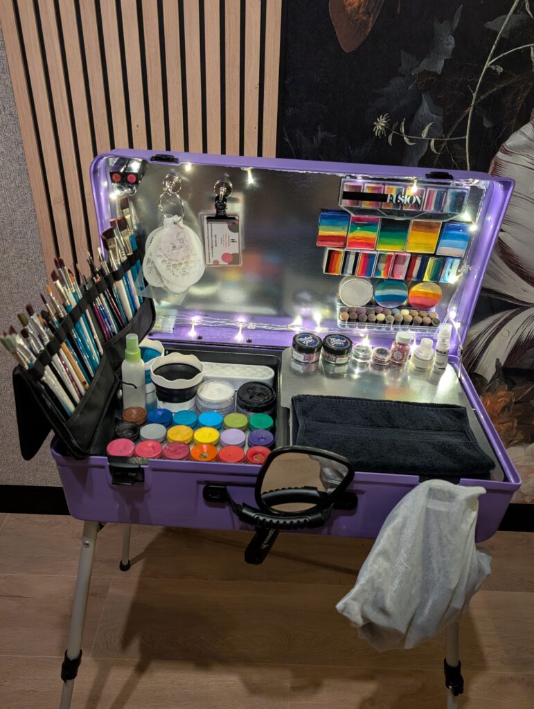 Er wordt geschminkt met de merken Superstar, Grimas, Fusion Body Art en Diamond FX, dit zijn allen schminken op waterbasis. Deze merken voldoen aan de strenge eisen die gesteld worden door de Europese Cosmetica Wetgeving. Zelf zorg ik voor goede hygiëne van de te gebruiken materialen.